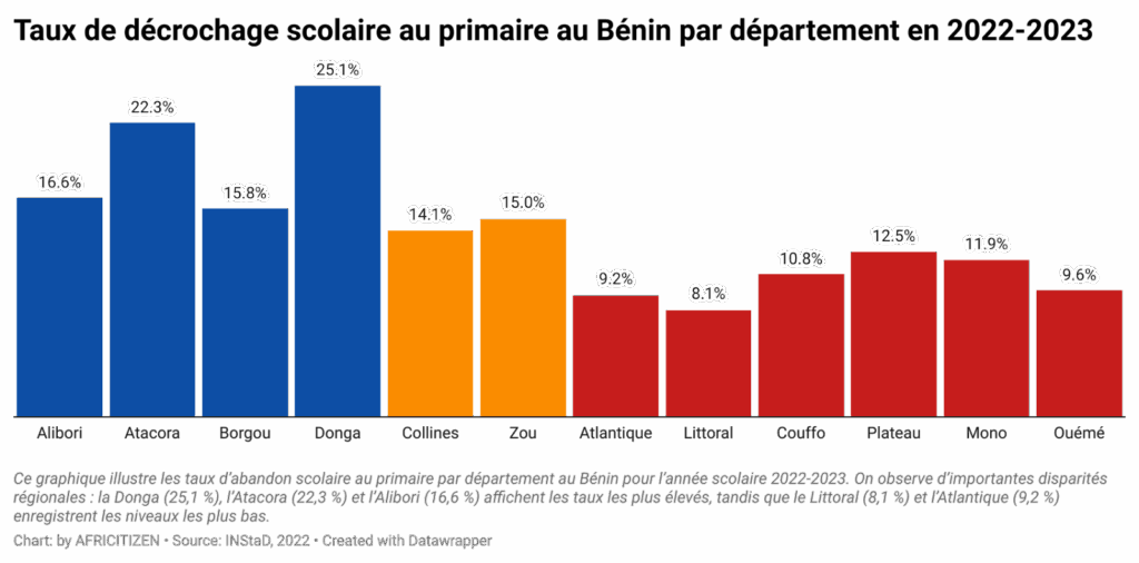 Les départements du Nord concentrent les taux d’abandon scolaire les plus préoccupants en 2022-2023. La Donga au nord-ouest du pays enregistre un taux d’abandon de 25,1 %, suivie de près par les départements de l’Atacora (nord-ouest) avec 22,3 % et l’Alibori au nord-est avec 16,6 % (INStaD, 2022). À l’opposé, deux départements du Sud affichent des niveaux nettement inférieurs. Le département du Littoral limite son taux d’abandon scolaire au primaire à 8,1 %, et l’Atlantique à 9,2 % (INStaD, 2022).